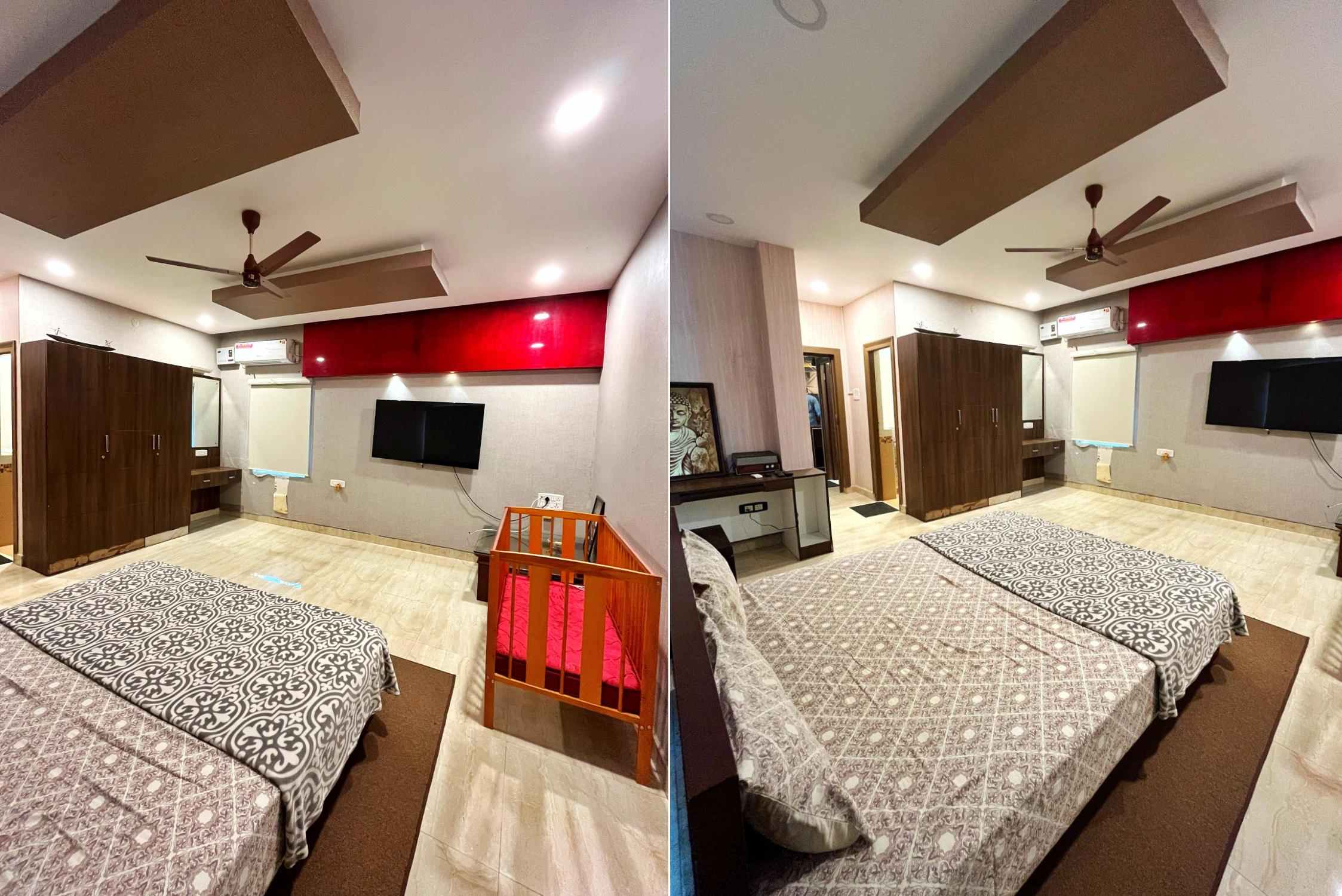 A spacious retreat featuring a plush king bed, private balcony, and an immersive home theater for ultimate relaxation. Perfect for unwinding with scenic views, cozy evenings, and a touch of in-room luxury.